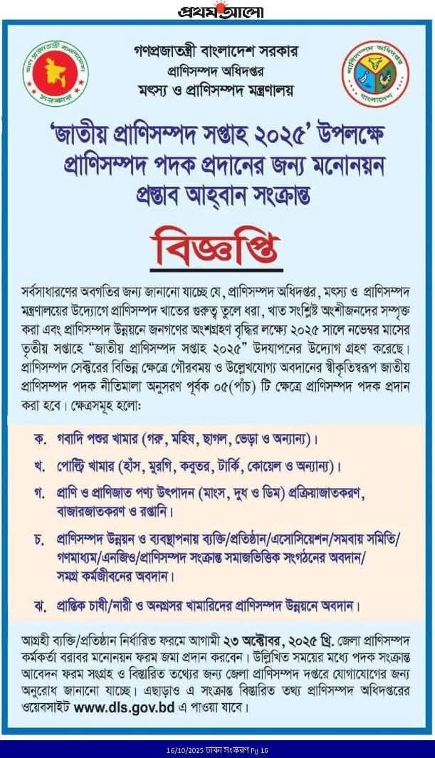 | ১ | জাতীয় প্রাণিসম্পদ সেবা সপ্তাহ ২০২৫ এ প্রাণিসম্পদ পদক সংক্রান্ত বিজ্ঞপ্তি | | ২০-১০-২০২৫ | দেখুন | |